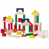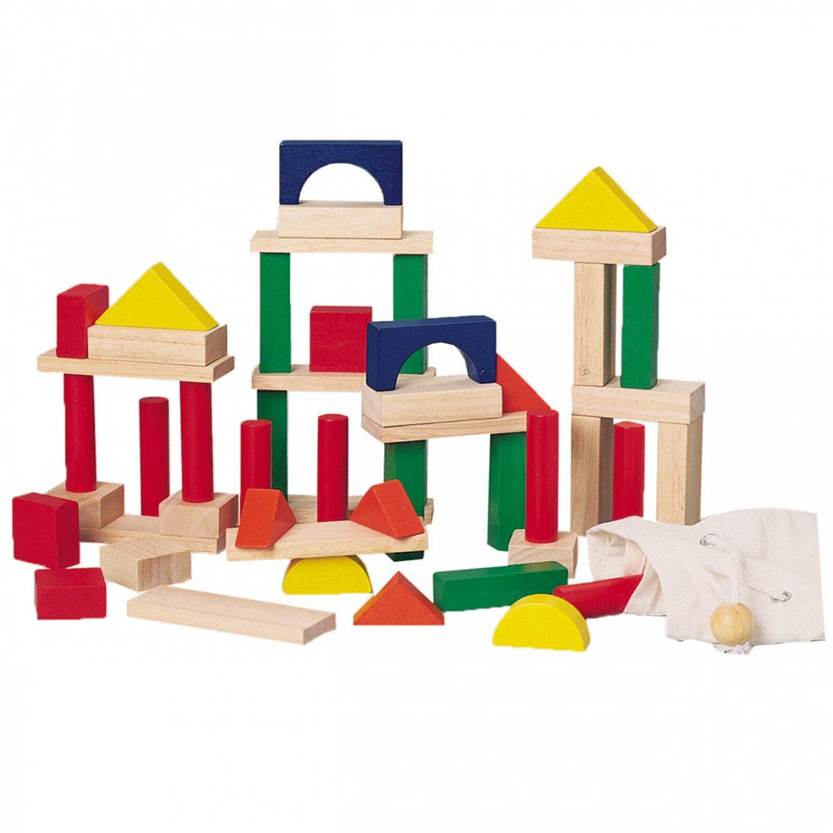 Natural and colored blocks in 10 different sizes and shapes all store in a drawstring fabric bag. Blocks have non-toxic finishes and are ¾ inch thick. Planks measure 4.75" x 1.5" x .375" thick. Ages 3 yrs. +.