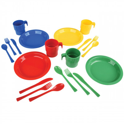 This set of tough, pliable plastic tableware includes 4 cups, 4 plates, and 4 each of forks, knives, and spoons in a storage tray. Set is in four colors. Ages 19 mos. +.