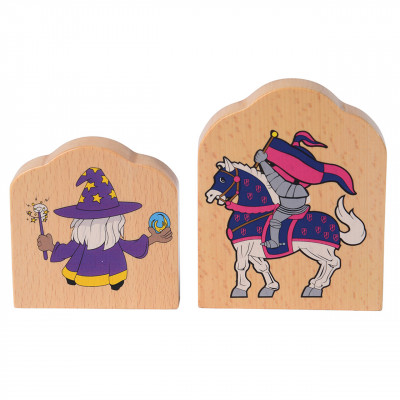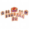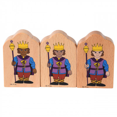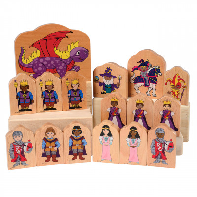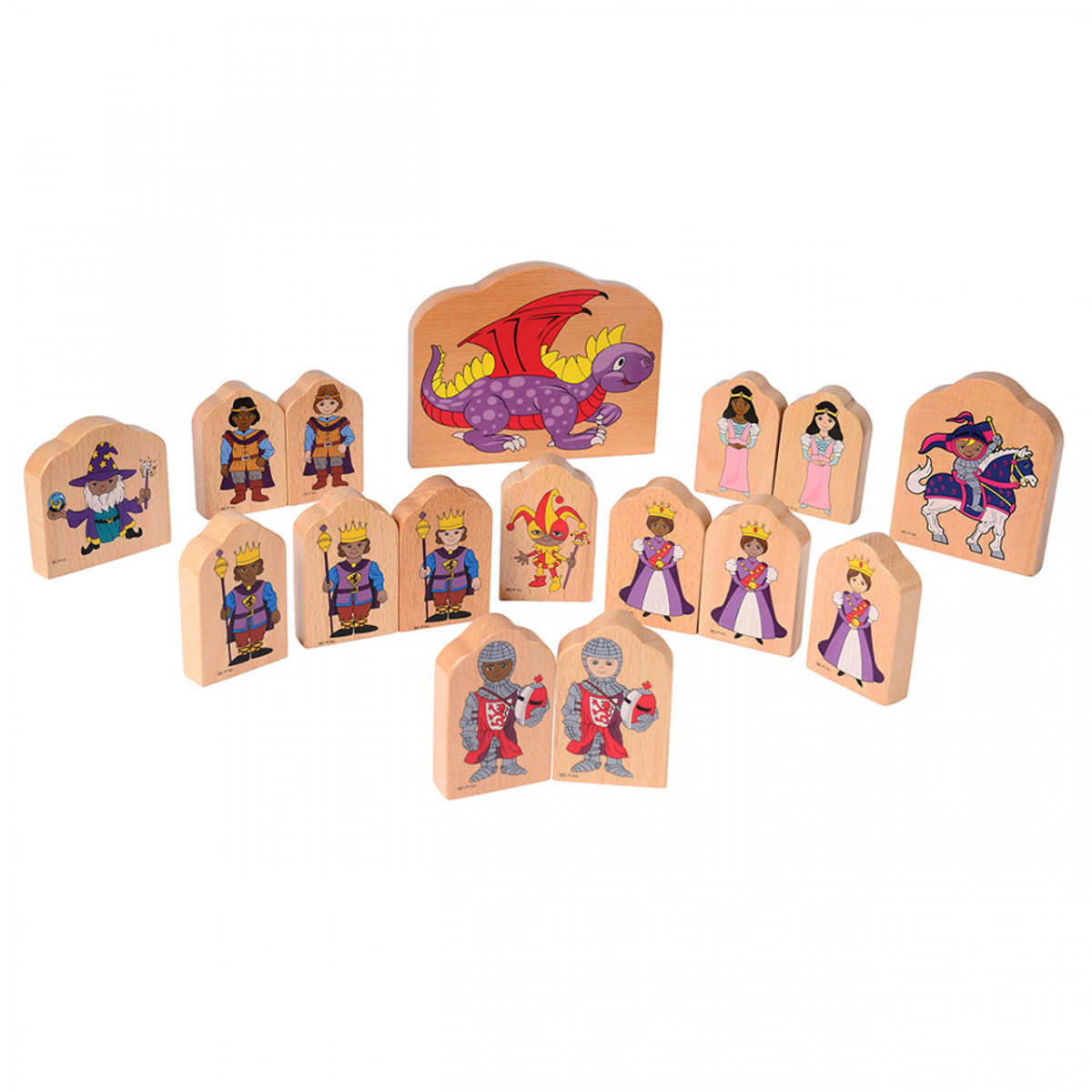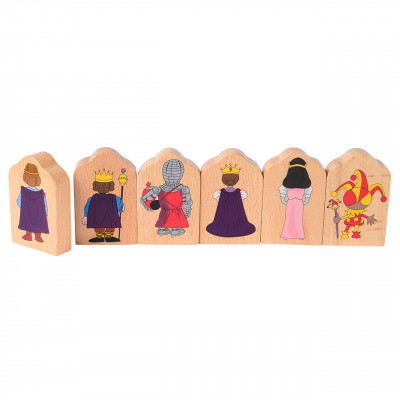 16 solid beechwood royal figures with heat transfer printing of the charcaters' fronts and backs. Smallest characters measure 2 3/4 inch W. x 1 3/4 inch H. x 1/2 inch D.