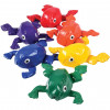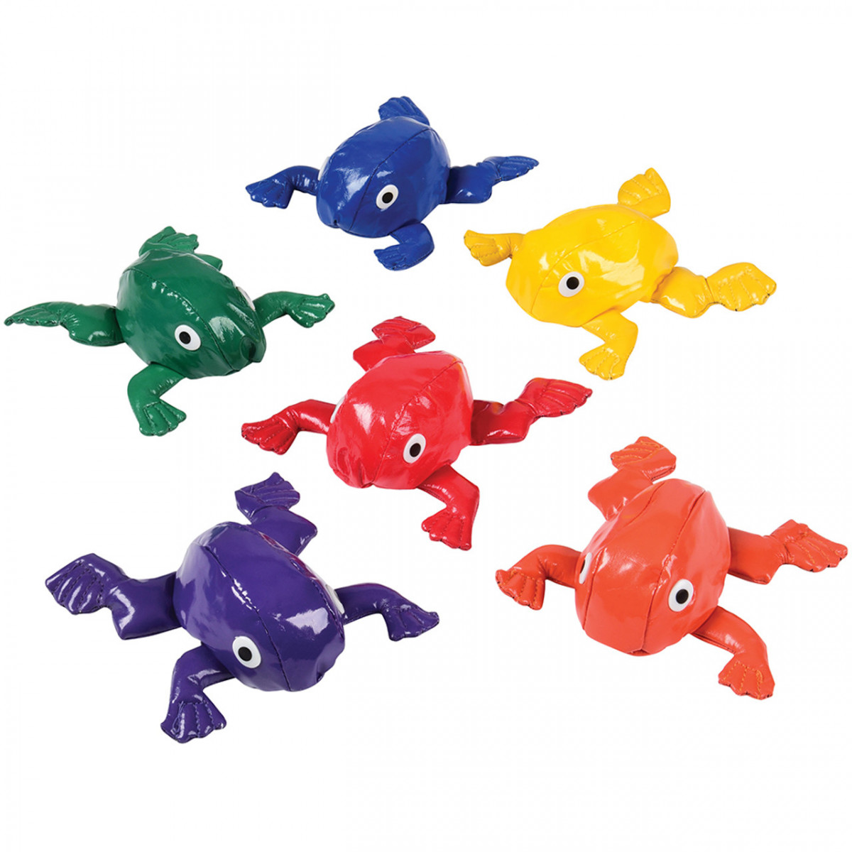 6 colorful frogs have wipe clean vinyl bodies stuffed with polystyrene beads. 5″ long. All ages.