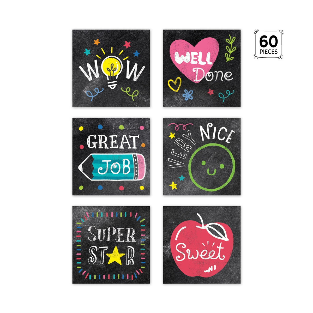 Reward students with these Colorful Chalk Rewards Stickers. Inspirational sayings such as "Well Done," "Great job," "Very Nice," and "Sweet" are paired with bright images on a chalkboard-style background to create motivating reward stickers that will appeal to children of all ages.