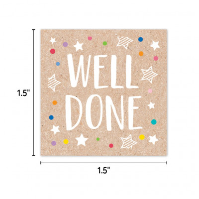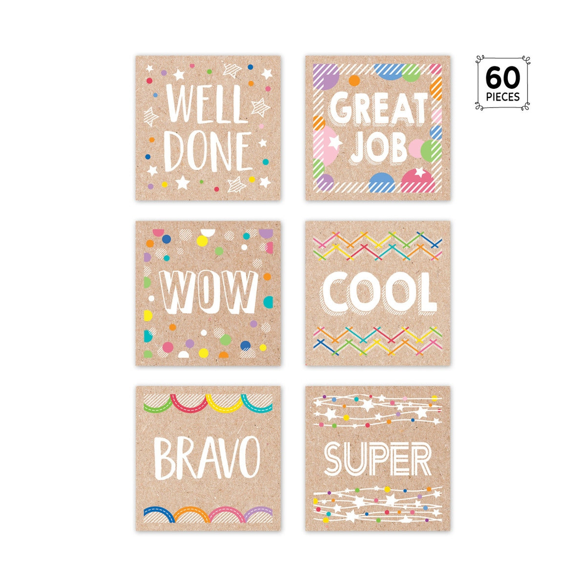 Reward students with these Colorful Kraft Rewards Stickers. Inspirational sayings such as "Well Done," "Great job," “Bravo,” and “Cool” are paired with colorful designs on a kraft-style background.