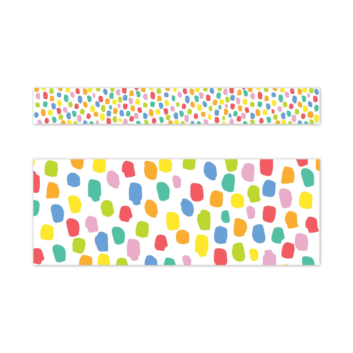 This Colorful Messy Dots EZ Border features brightly colored casual dots on a white background. These irregularly shaped messy dots are the newest trend in polka dots. Use the border by itself or layer it with another border for a unique look. Perfect for use on bulletin boards in a wide variety of classroom, office, and school settings. These EZ borders come in smaller strips, which are easier to manage and store. Each package comes with enough borders to complete 2 full bulletin boards.