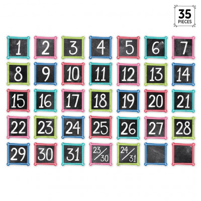 Brighten each day of the month with the colorfully trimmed Colorful Chalk Calendar Days! These versatile cut-outs are designed to look great on any calendar chart. Pack contains 31 number days, 2 combined number days (23/30 and 24/31), and 2 blank days for highlighting special events or holidays and recognizing birthdays. Calendar Days are great for use on a classroom calendar during the daily calendar lesson or circle time. They can also be used as student numbers to label cubbies, folders, desks, and more!