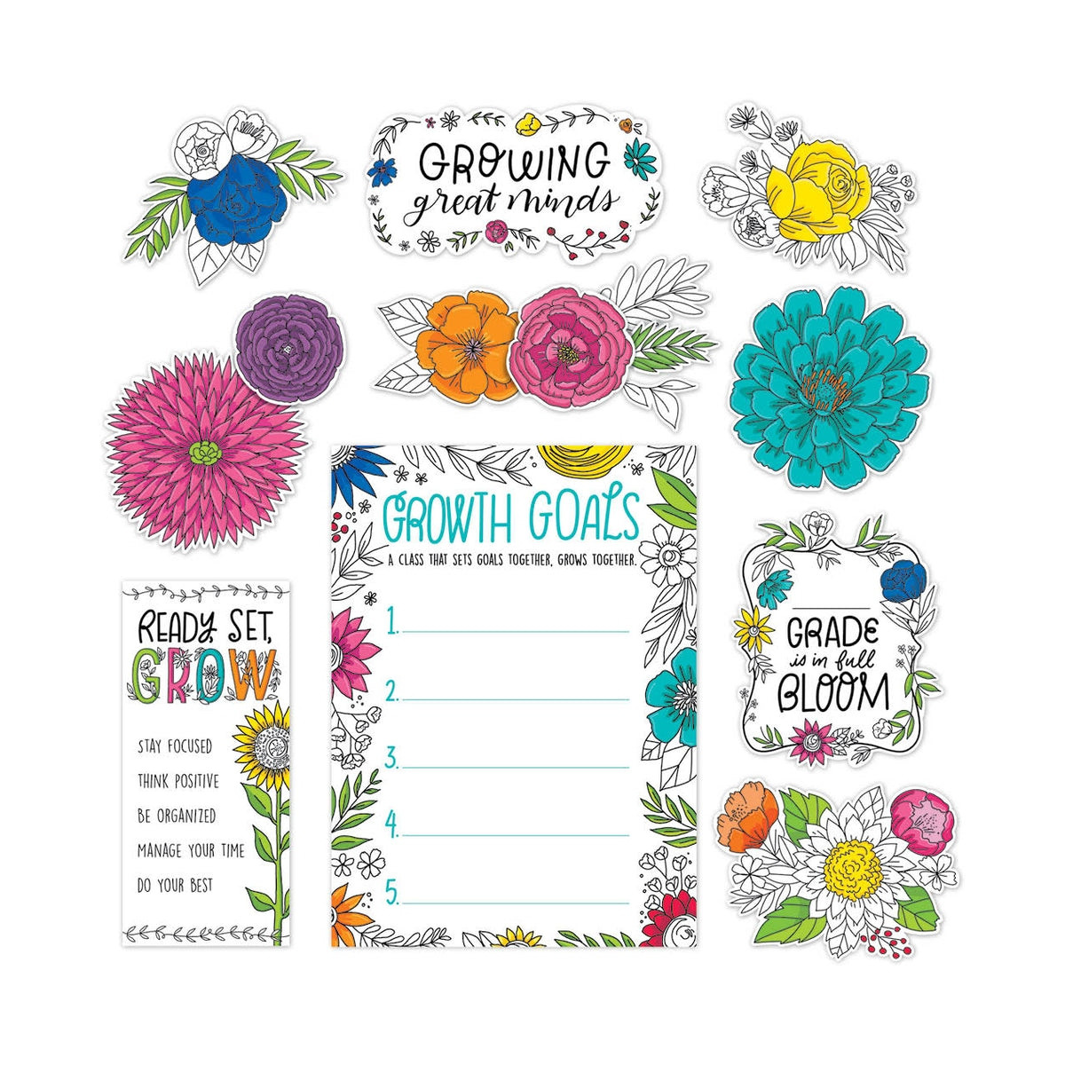 Growing great minds is the theme of this Blooming Minds Bulletin Board. Pieces offer encouraging tips for student success and a place for recording class goals. The fresh, casual design features flowers in slightly pastel colors popping on a white background, perfect for brightening any space.