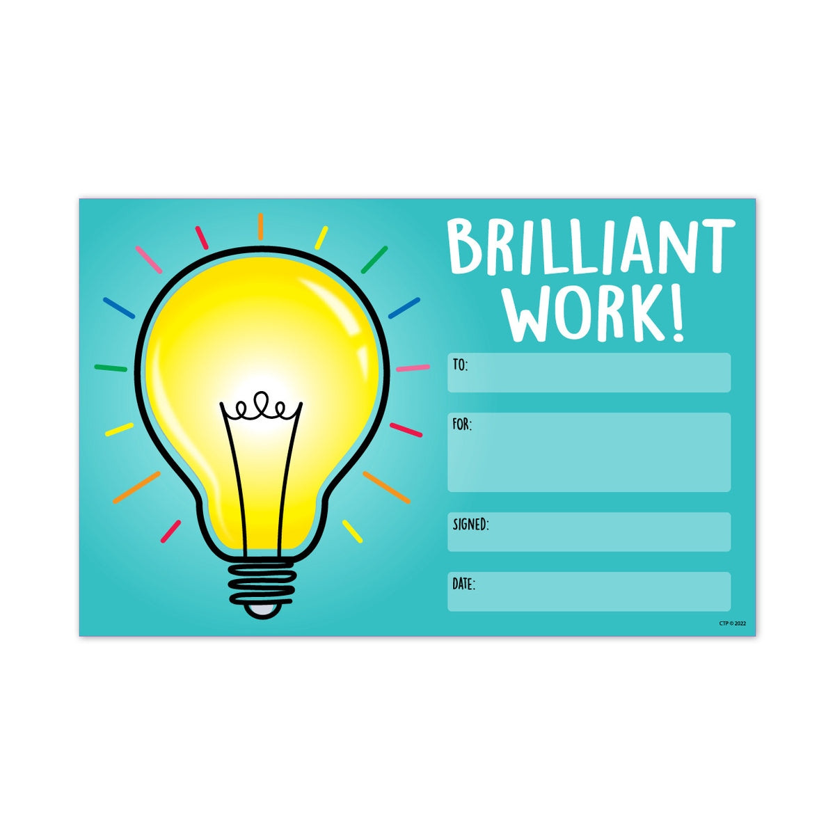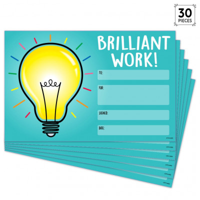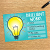 Shine a light on a job well done with these Brilliant Work! Awards. Featuring a bright yellow lightbulb, each award is a fitting certificate for children in a wide range of age or grade levels. Awards are easy to customize for each student and special achievement. Awards are printed on sturdy paper stock so they can be enjoyed for years to come.