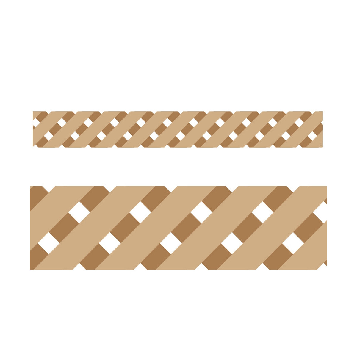 Bring the feel of a criss-crossed wood pattern to your bulletin boards and classroom displays with this Lattice Border. It is perfect for creating a "garden" or "outdoorsy" decor theme in the classroom. The design's imagery of actual criss-crossed wood gives this border a natural appearance. It is great for creating bulletin boards about gardening and nature. These new EZ borders come in smaller strips, which are easier to manage and store. Each package comes with enough borders to complete 2 full bulletin boards.