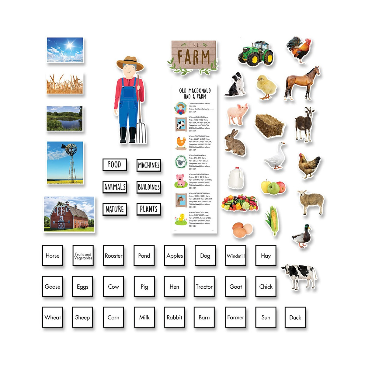 A great interactive set for introducing students to life on a farm, this Farm Friends The Farm Mini Bulletin Board includes pictorial and text representations of what is on a farm — food, animals, nature, machines, buildings, and plants. The real photographs make it perfect for early childhood classrooms and preschools. Pieces are just the right size for a pocket chart or for use in a center.