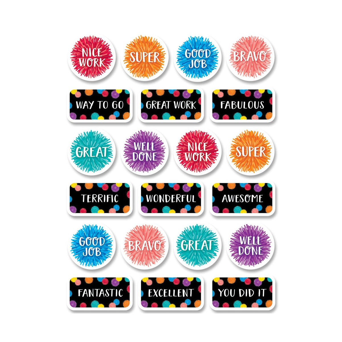 Reward students for outstanding work, great effort, good behavior, and a positive attitude with these cheerful Pom-Pom Rewards Stickers. The positive words and colorful designs will brighten any student's day.