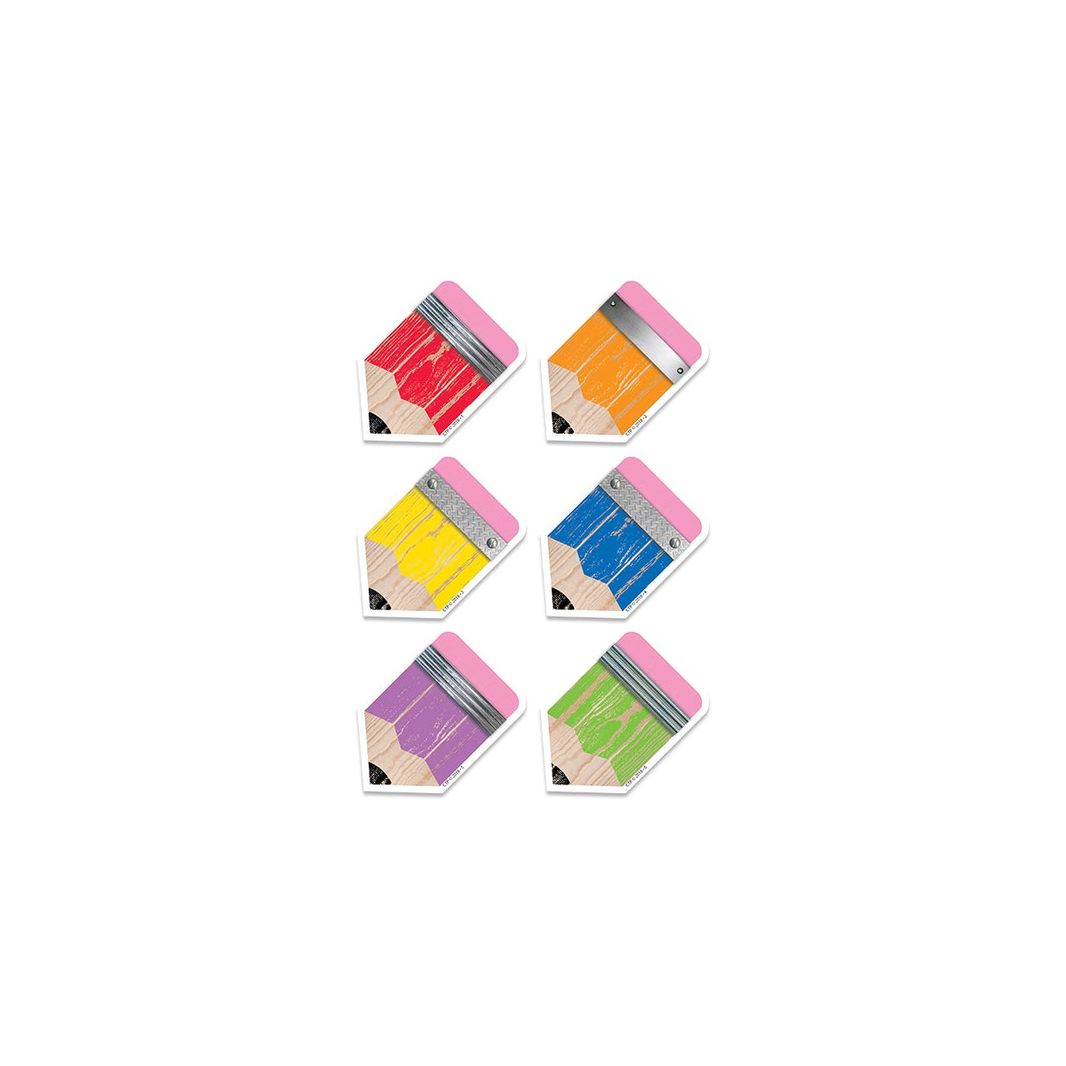These rustic "wooden" Pencils 3" cut-outs are an iconic symbol of school and learning. The realistic-looking worn paint, metal banding and bright colors give these pencil cut-outs a familiar, yet modern feel. Use these pencil cut-outs in student writing projects, writing center games or displays, and on writing-themed bulletin boards.