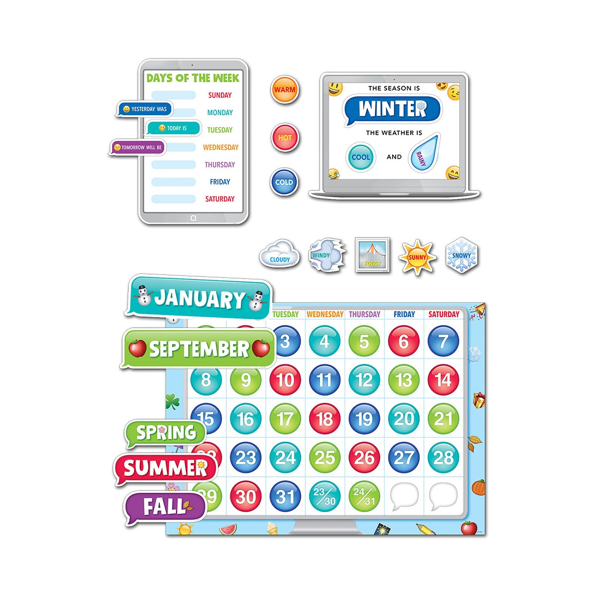 The Emoji Fun Calendar Set Bulletin Board brings the sweet, silly, smiley emoji faces and icons to your calendar bulletin board. Students will love the emoji faces and icons on the calendar all year long! This calendar set includes a calendar chart, 12 month headlines, 31 pre-numbered calendar days, and 4 blank calendar days. The set also includes a days-of-the-week chart, a seasons and weather chart, and coordinating labels. The emoji faces make this set perfect for non-readers, non-English speaking students (ESL/ELL), and children and adults of all ages.