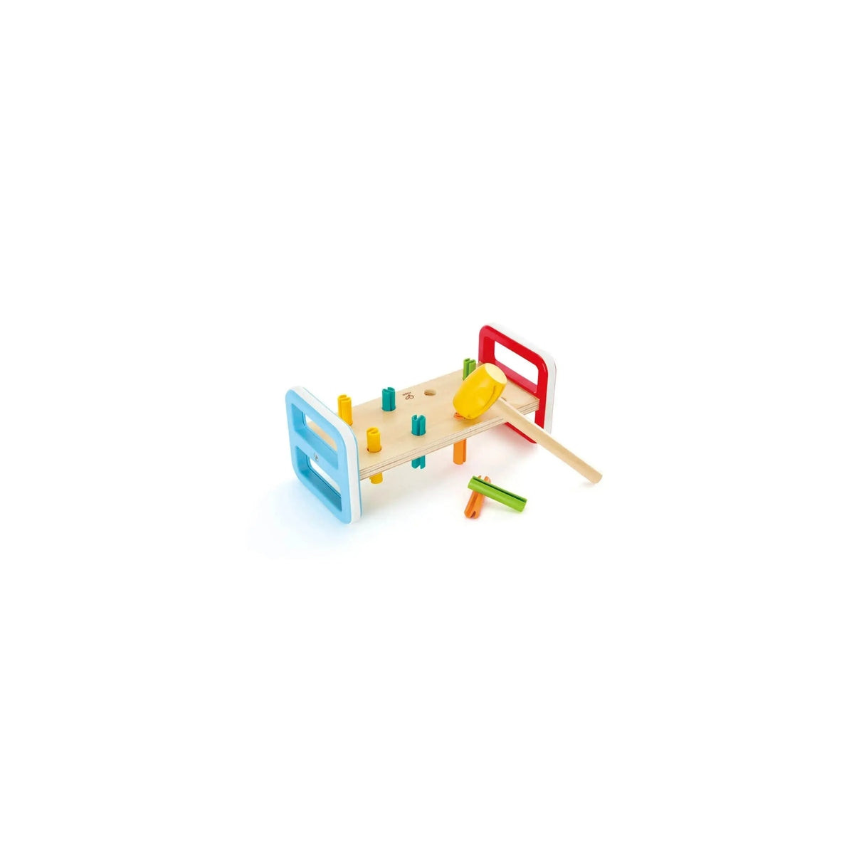 Hape Rainbow Pounder teaches children about colors and numbers. Children are encouraged to hammer in the pegs, turn over the bench to hammer them again.