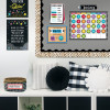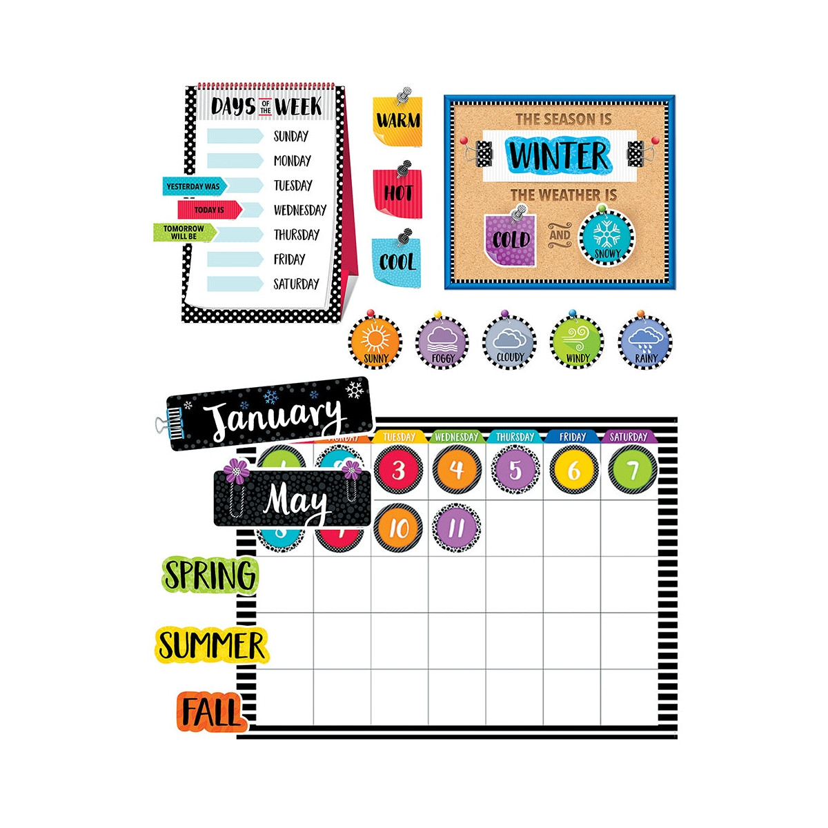 The Bold & Bright Calendar Set Bulletin Board features bold black and white contrasted by pops of bright colors. Stripes, dots, and spots combine with playful school supply accents such as binder clips, push pins, sticky notes, and corkboard to add color and texture to this modern look. This 67-piece calendar set includes a calendar chart, 12 month headlines, 31 pre-numbered calendar days, and 4 blank calendar days. The set also includes a days-of-the-week chart, a seasons and weather chart, and coordinating labels. The bright colors and modern design make this set perfect for children and adults of all ages.