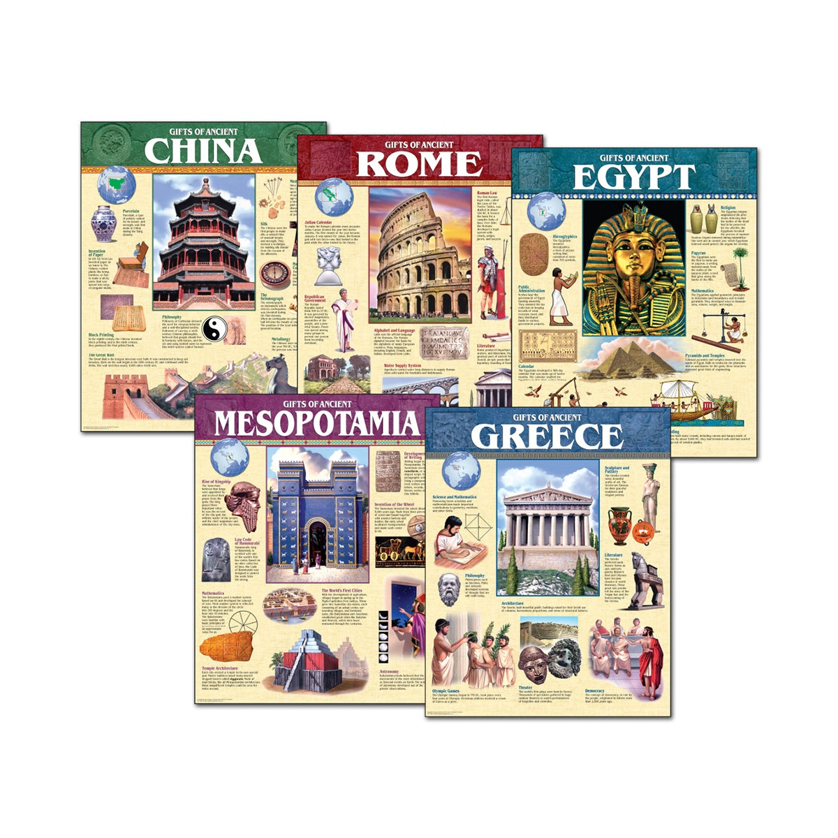 Includes 1 each of 5558 Gifts of Ancient China. 5559 Gifts of Ancient Rome, 5560 Gifts of Ancient Mesopotamia, 5561 Gifts of Ancient Egypt, and 5562 Gifts of Ancient Greece. Charts measure 17" x 21 3/8"