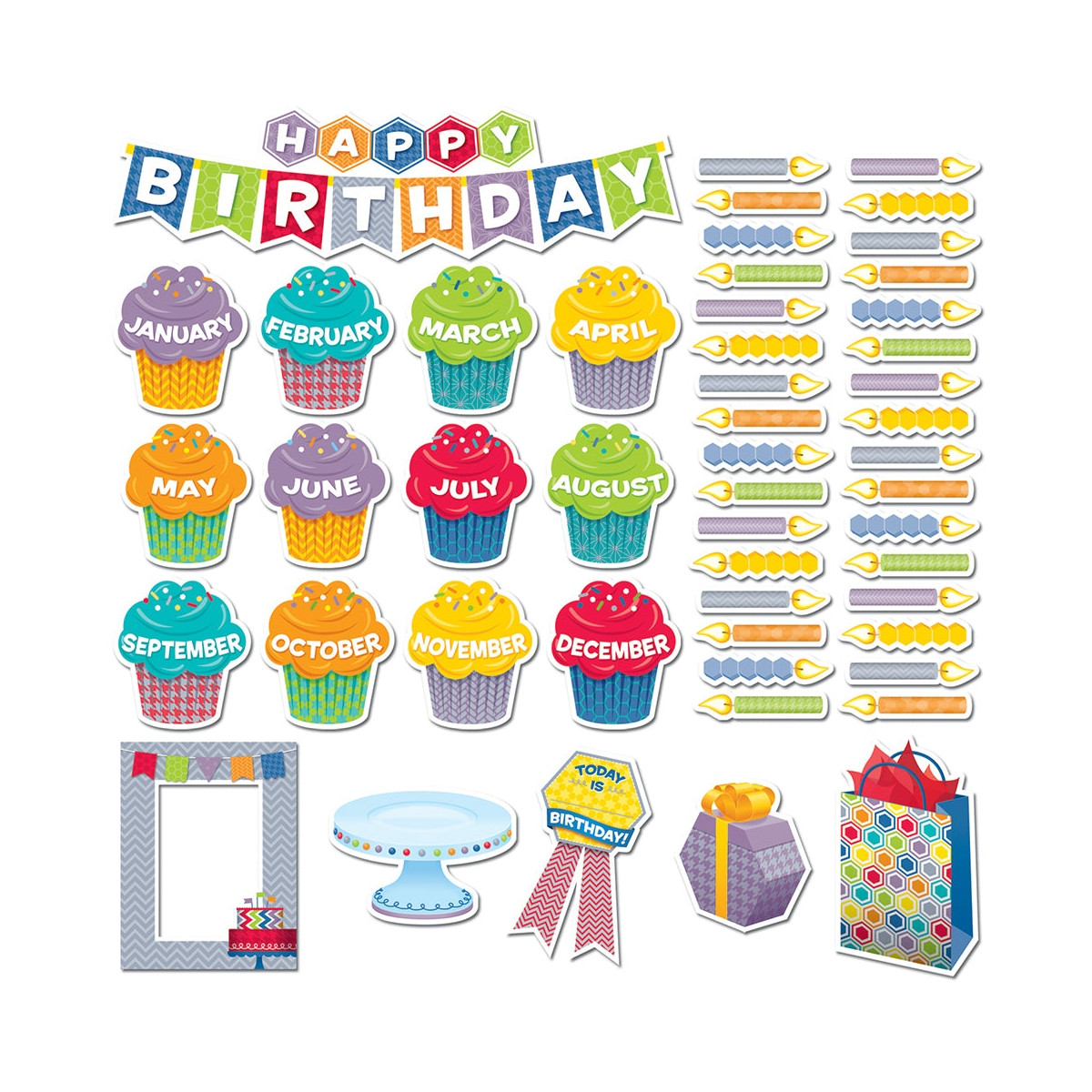Celebrate birthdays with the 54 pieces in this stylish and colorful set. Use the birthday badge, photo frame, and present pieces to make the day extra special. Create a bulletin board display to highlight the birthdays in each month.