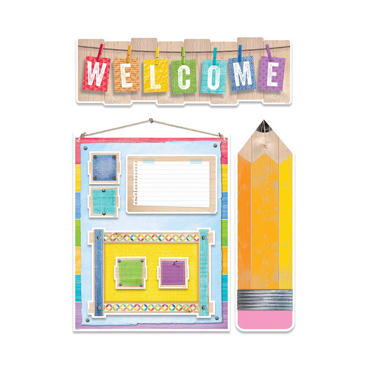Welcome students back-to-school with Upcycle Style! In this bulletin board set, realistic looking rustic woodgrain is layered with colored textures, fun fabrics, metal accents, and playful patterns to create a cozy charm that is both modern and familiar. Upcycle Style will make your classroom feel warm, friendly and inspiring with its realistic looking imagery. Set includes 41 pieces: a 23 ¼" x 7 ½" welcome sign, 36 student pieces, a 17" x 23 ½" blank chart, 2 blank signs and a 23 ½" x 6 ½" oversized rustic yellow pencil.