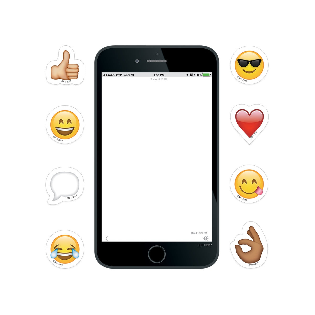 These Emoji Smartphone 6" Cut-Outs are simple but fun cut-outs for a variety of uses! This set includes black, realistic-looking smartphones and 288 bonus emoji accents (thumbs up, smiley face, speech bubble, laughing w/ crying eyes, sunglasses, heart, silly face with tongue, OK sign).