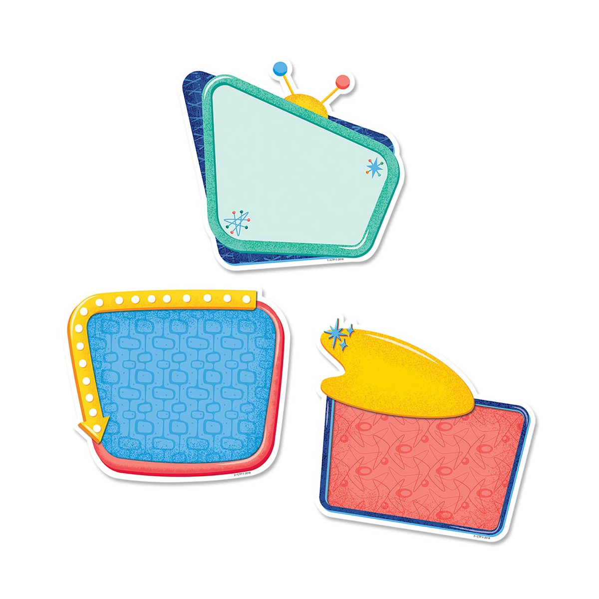 These Mid-Century Mod Retro Signs 6" Designer Cut-Outs bring back the look and feel of the ever popular mid-century design trend! One recognizable element of this design period was the charming and unique style of signs. The distinctive MCM design was found in every sign imaginable, including those for donut shops, hotels, bowling alleys, grocery stores, and street signs. This pack of sign cut-outs brings the classic shapes, colors, and styles of these nostalgic signs to the classroom. These blank and easily customizable signs can be used for just about anything—labels for storage bins, tags for student desks or cubbies, accents on bulletin boards, and more!