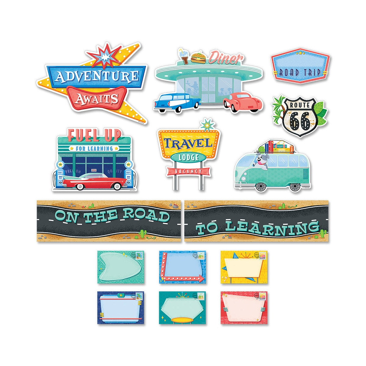 This 44-piece road trip bulletin board set includes: