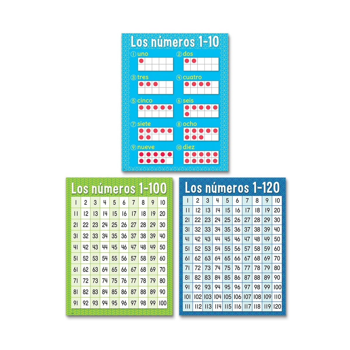 The charts in this Numbers 3-Chart Pack provide a convenient classroom reference for numbers 1-10, 1-100, and 1-120 as well as the Spanish number words to ten (diez).