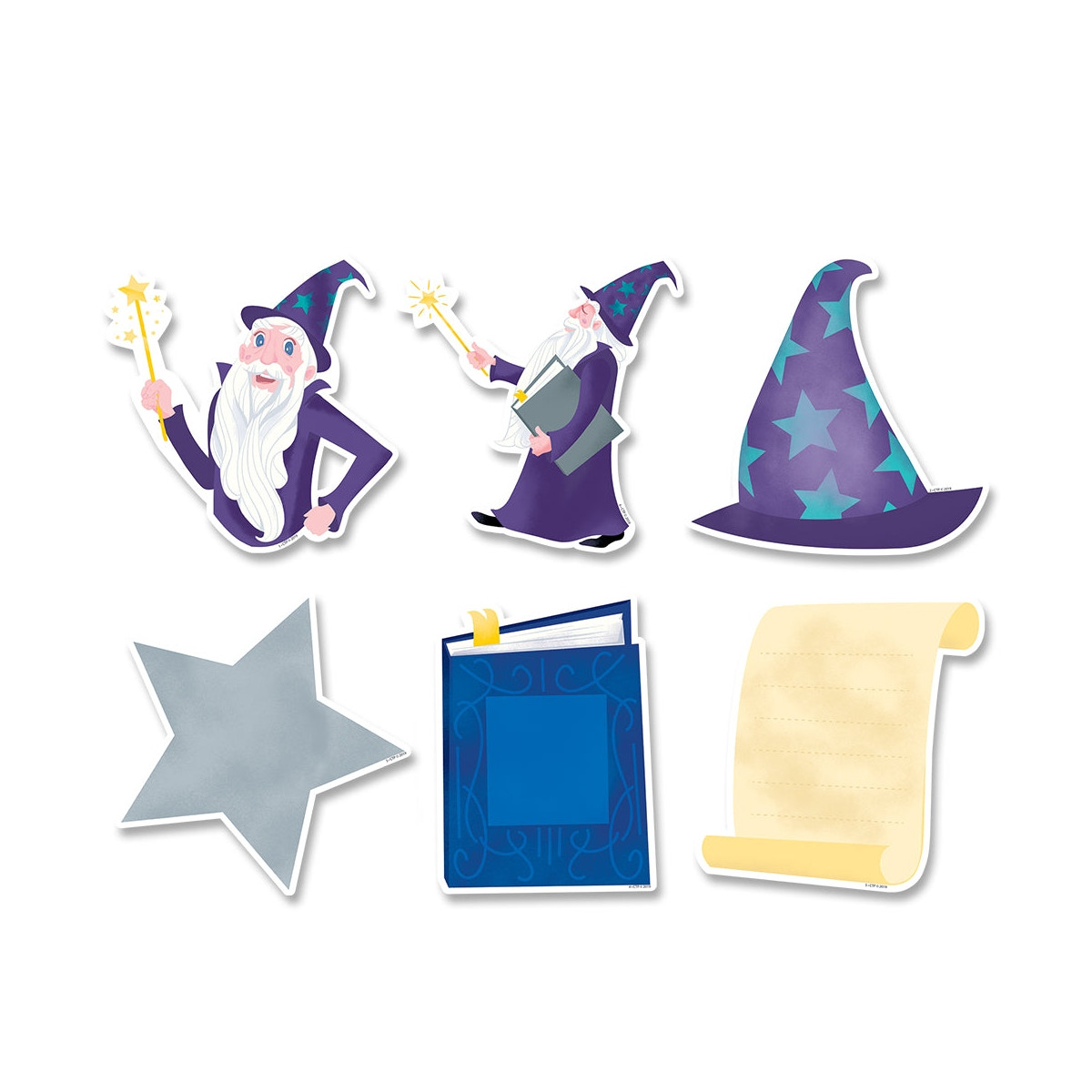 Cast a spell for a good school year! These Wizardly Fun 6" Designer Cut-Outs will bring enchanting fun to your classroom. They can be used as labels for storage bins, desk tags, accents on bulletin boards, writing prompts, learning center activities, and more! Create a bulletin board or student project around these themes: "Mystical Adventures in Science (or insert any topic)," "Magical Work," and "Third Grade Wizards" for a back-to-school-themed bulletin board.