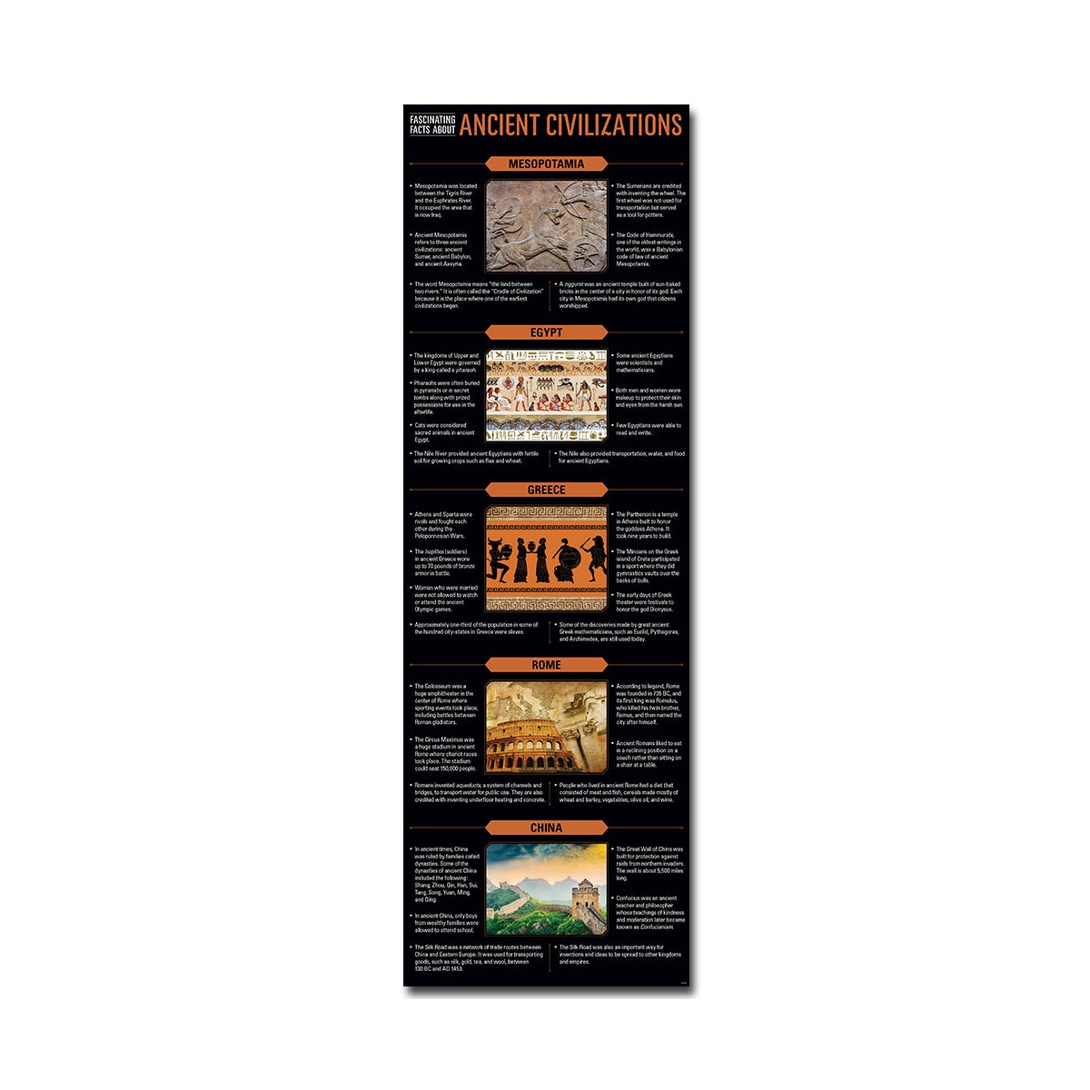 This Ancient Civilizations Giant Banner encourages students to learn fascinating facts about ancient civilizations. It covers facts from 5 ancient civilizations: Mesopotamia, Egypt, Greece, Rome, and China. The content on this banner helps students make personal, real-world connections with ancient history and supports critical thinking.