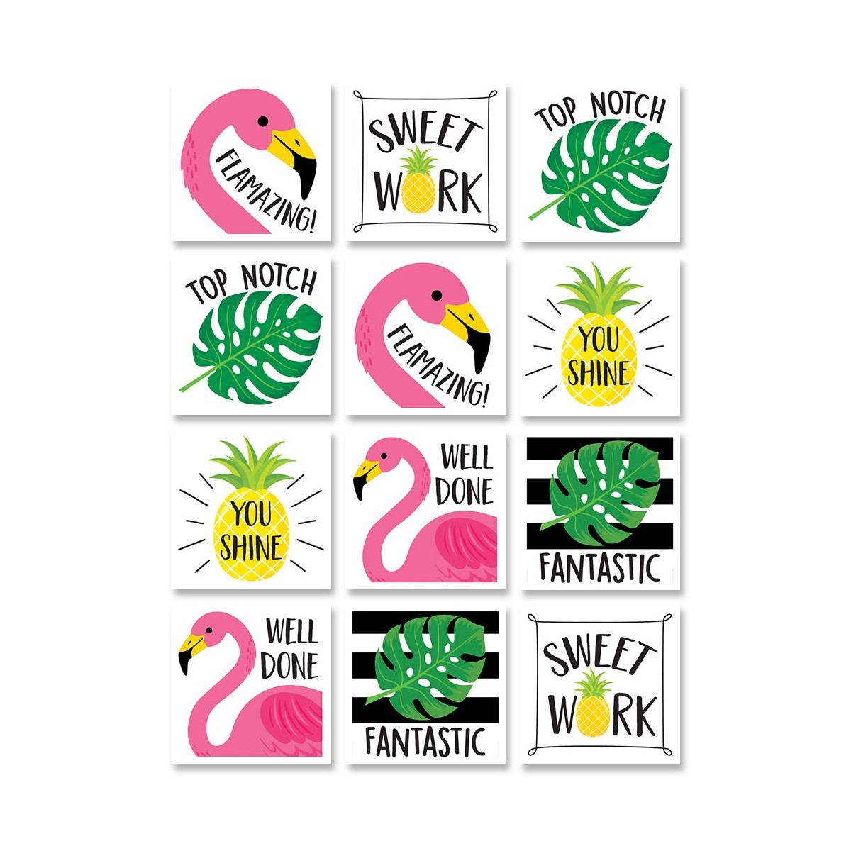 Recognize students for outstanding work, good behavior, and a positive attitude with these fun Palm Paradise Rewards Stickers. The bright colors and positive sayings will encourage students to produce "sweet work" and "top notch" behavior all year long. Set features images of monstera leaves, flamingos, and pineapples!