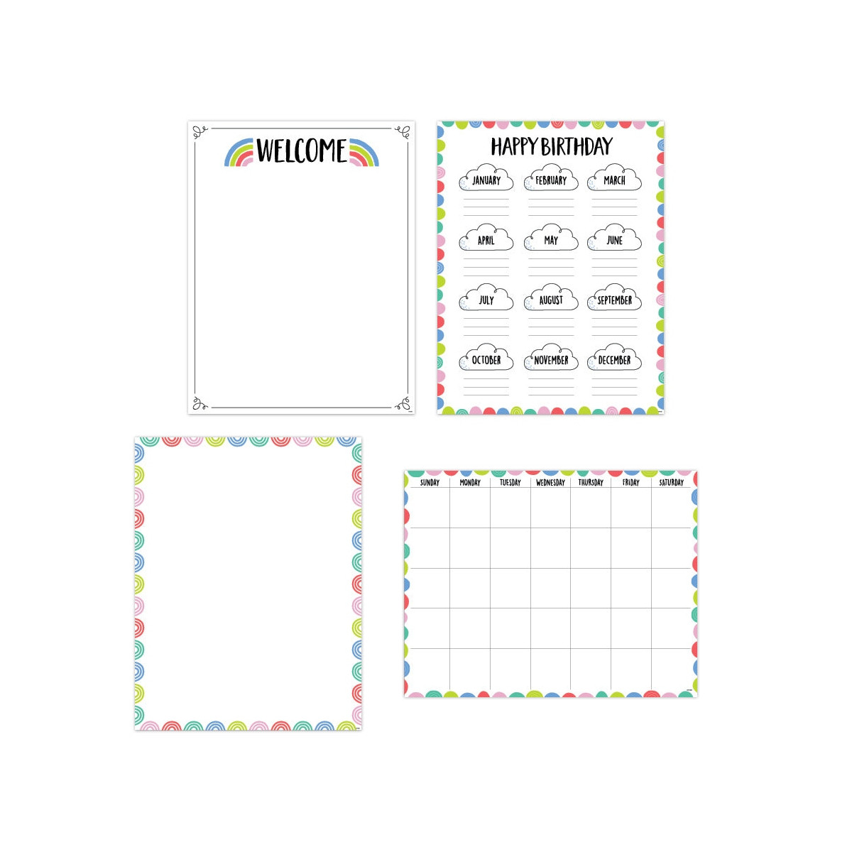 The bright colors and fun designs in this Rainbow Doodles Classroom Essentials 4-Chart Convenience Kit make these charts a stylish way to organize and communicate important information in any classroom. Pack contains a welcome chart, birthday chart, blank chart, and calendar chart.