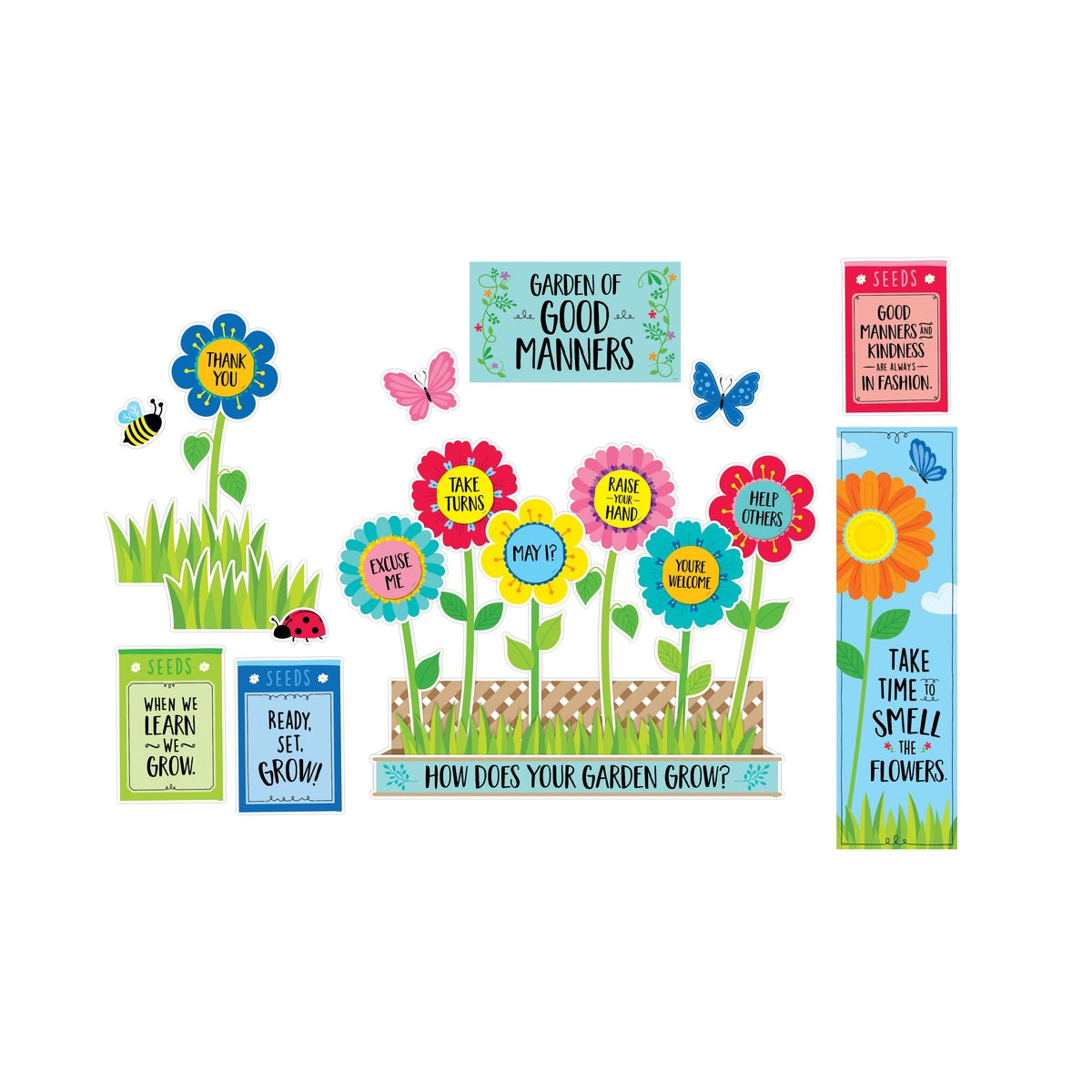 Good manners will bloom all over your classroom with the helpful reminders from this brightly colored Garden of Good Manners Mini Bulletin Board. This set highlights good manners for students: Thank You, May I?, Take Turns, I'm Sorry, Excuse Me, You're Welcome, Please, Raise Your Hand, and Help Others. The colorful flowers and garden accents will brighten any space all year long.