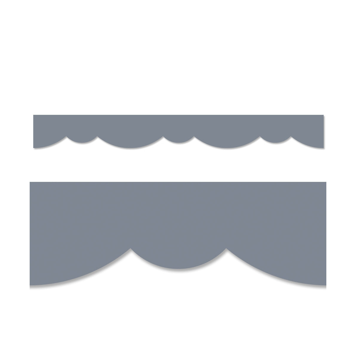 A fun, fresh twist on a solid gray border! This Charcoal Gray Stylish Scallops Border features a playful double scallop design to create a neat and easy way to edge any bulletin board or classroom display. Great for any type of school setting at any grade level! Also great for use on bulletin boards in an office, a church, a college dorm, or a homeschool classroom. With its versatile scallop design, this bulletin board border can be used alone to create a basic look or layered with another border for a more designer look. These new EZ borders come in smaller strips, which are easier to manage and store. Each package comes with enough borders to complete 2 full bulletin boards.