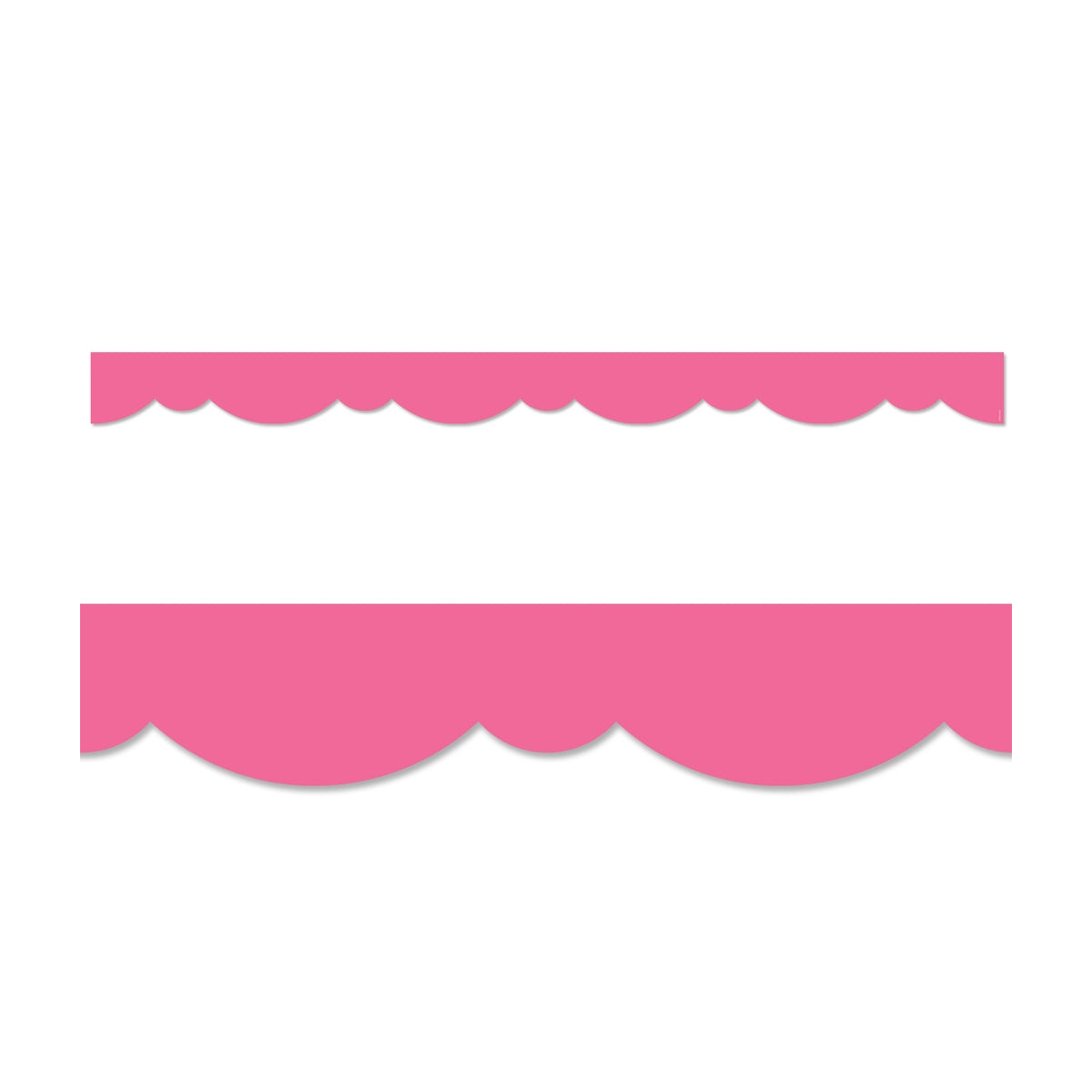 A fun, fresh twist on a solid border! This Pink Stylish Scallops EZ Border features a playful double scallop design to create a neat and easy way to edge any bulletin board or classroom display. Also great for use on bulletin boards in an office, a church, or a college dorm. With its versatile scallop design, this bulletin board border can be used alone to create a basic look or layered with another border for a more designer look. These new EZ borders come in smaller strips, which are easier to manage and store. Each package comes with enough borders to complete 2 full bulletin boards.