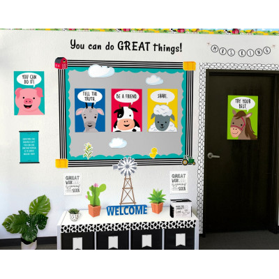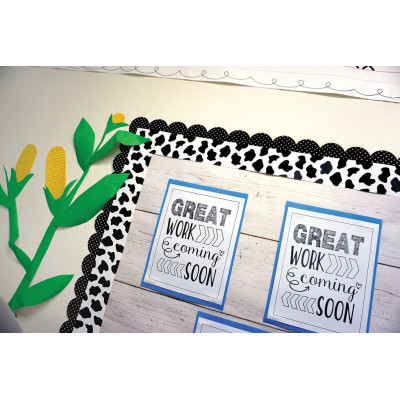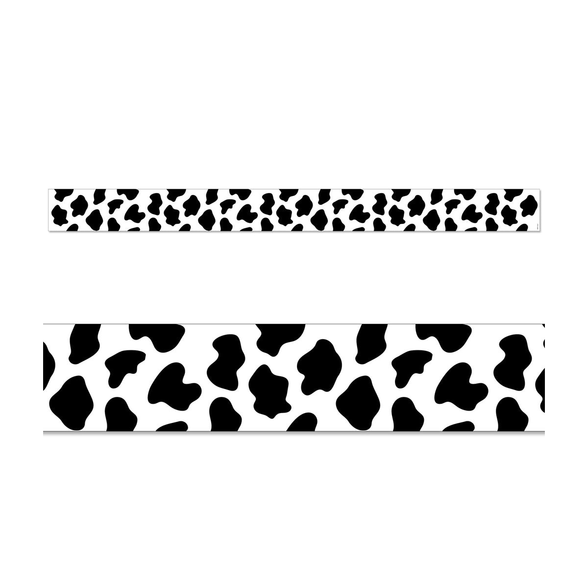 Get mooving and create some fun bulletin boards with this Cow Print EZ Border. This charming black and white print brings the feel of the farm to your bulletin boards. Perfect for an early childhood farm bulletin board. These new EZ borders come in smaller strips, which are easier to manage and store. Each package comes with enough borders to complete 2 full bulletin boards.