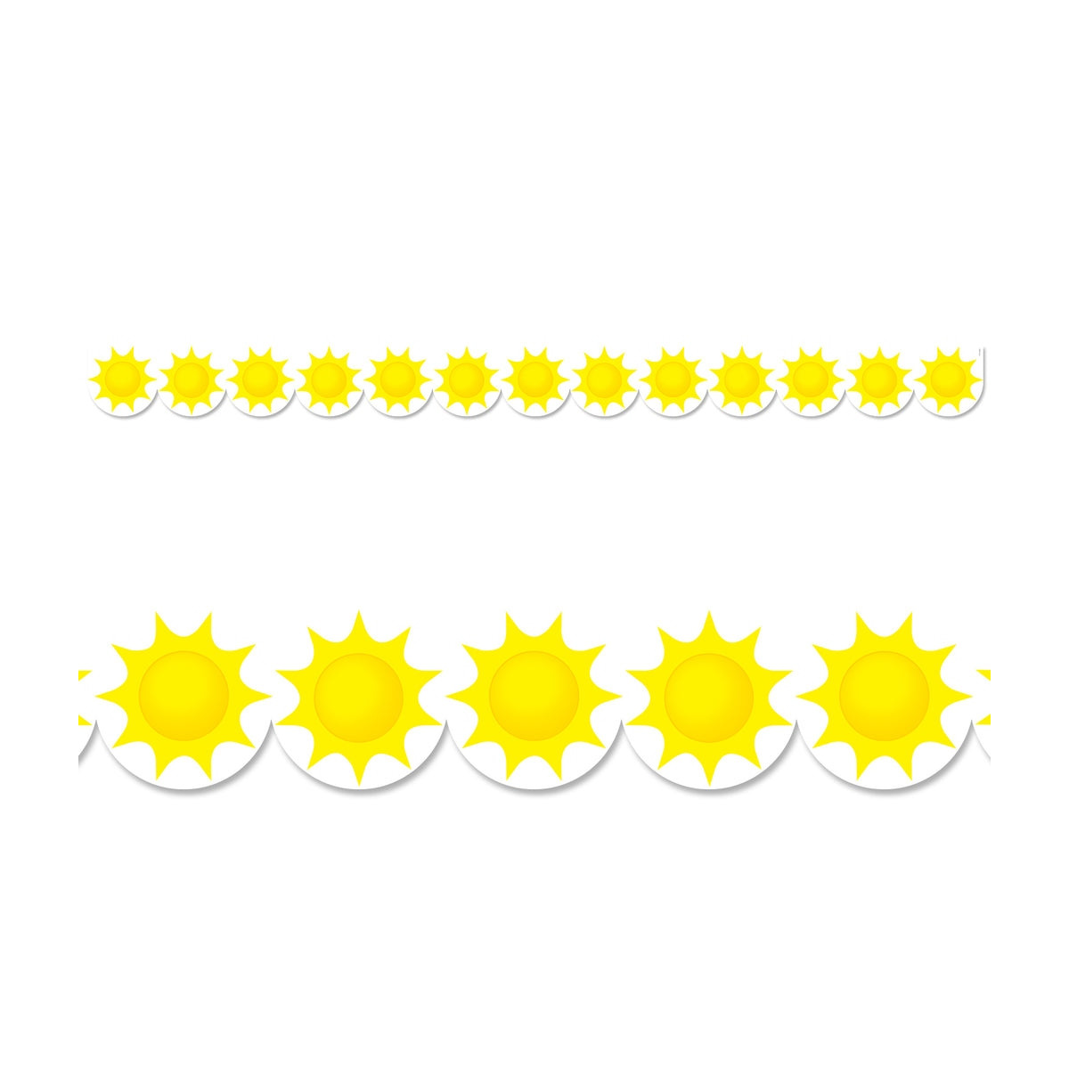 Brighten any bulletin board with this cheerful Suns EZ Border. Use these bright suns to trim a variety of bulletin boards with outdoor scenes, such as on a farm, in a garden, in a backyard, and at the beach. Great for displays about nature, science, camping, summer, and plants. These new EZ borders come in smaller strips, which are easier to manage and store. Each package comes with enough borders to complete 2 full bulletin boards.