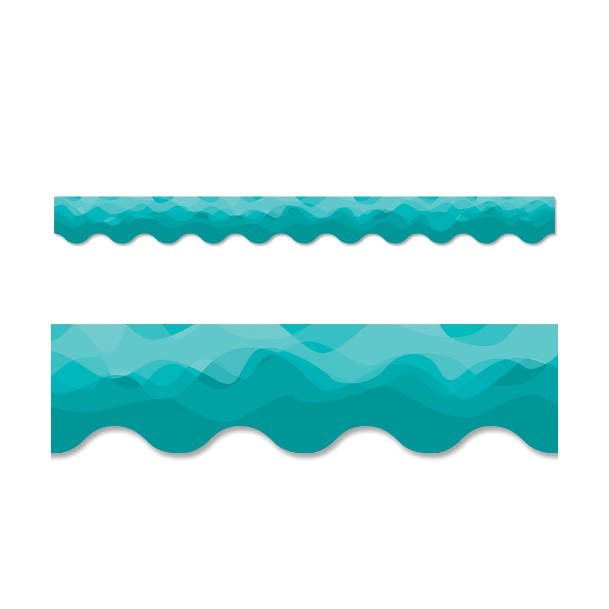 Simple and playful, this Waves of Teal Border evokes a feeling of nature and water. The vibrant blend of shades of teal creates a serene look that is perfect for bulletin boards with themes such as the ocean, under the sea, the beach, and sea animals. Layer multiple borders together to create ocean waves! These new EZ borders come in smaller strips, which are easier to manage and store. Each package comes with enough borders to complete 2 full bulletin boards.