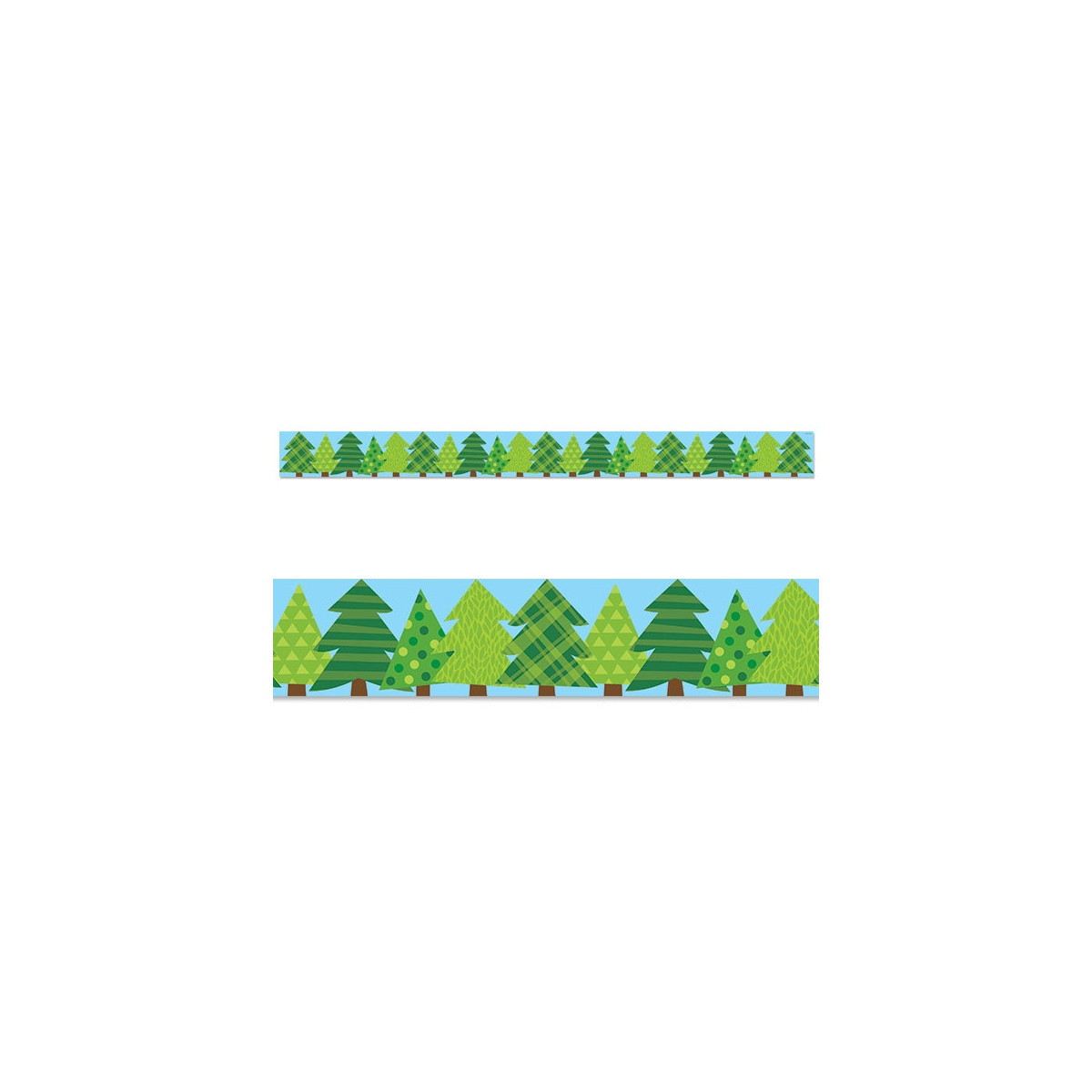 Playful evergreens stand in a row on this Patterned Pine Trees EZ Border. With subtle patterns of plaid, polka dots, leaves and stripes, these pine trees will complement a wide-variety of bulletin board displays including those related to camping, science, plants, nature, animals, winter and more. These new EZ borders come in smaller strips, which are easier to manage and store. Each package comes with enough borders to complete 2 full bulletin boards.