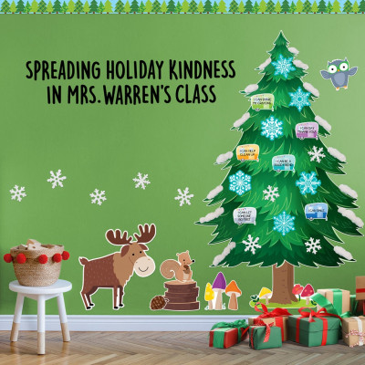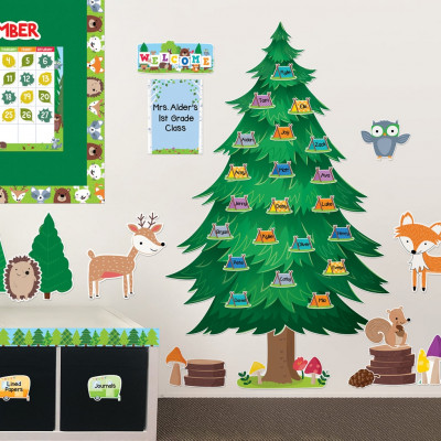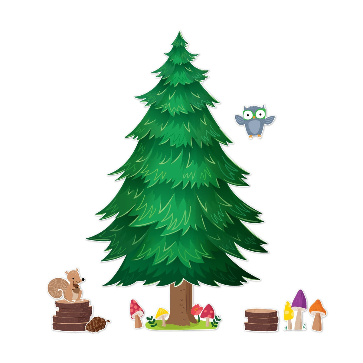Decorate for the holidays or add greenery to your classroom year-round with this Woodland Friends Jumbo Pine Tree Bulletin Board. When assembled, the pine tree stands 5 feet tall, perfect for all kinds of fun learning activities, seasonal commemorations, and community building endeavors. The set also comes with an owl and a squirrel, 4 pinecones, 4 colorful mushrooms, and 2 stacks of wood slices.