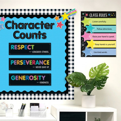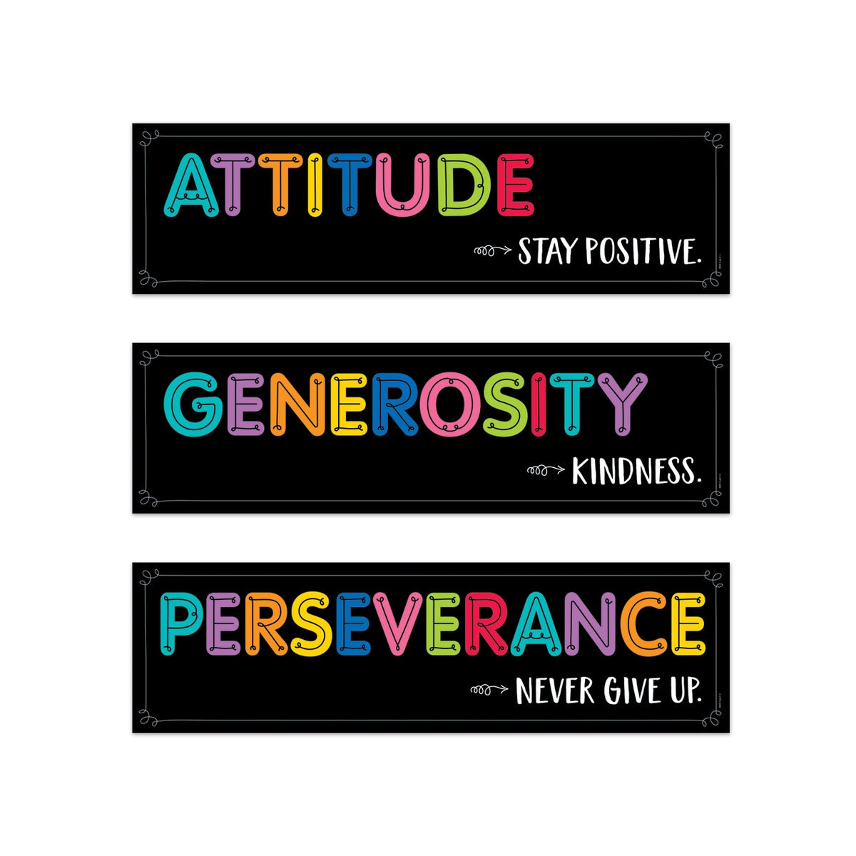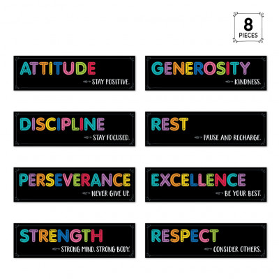 Help instill a positive mindset in your learning environment by displaying the 8 colorful messages in this Core Decor Mindset Motivation Headlines Mini Bulletin Board. Each big 21” x 6” headline features one of the following important character traits and healthy habits: a positive attitude, generosity, discipline, rest, perseverance, excellence, strength, and respect. The stylish and colorful text on a black background will brighten any room and make messages really stand out.