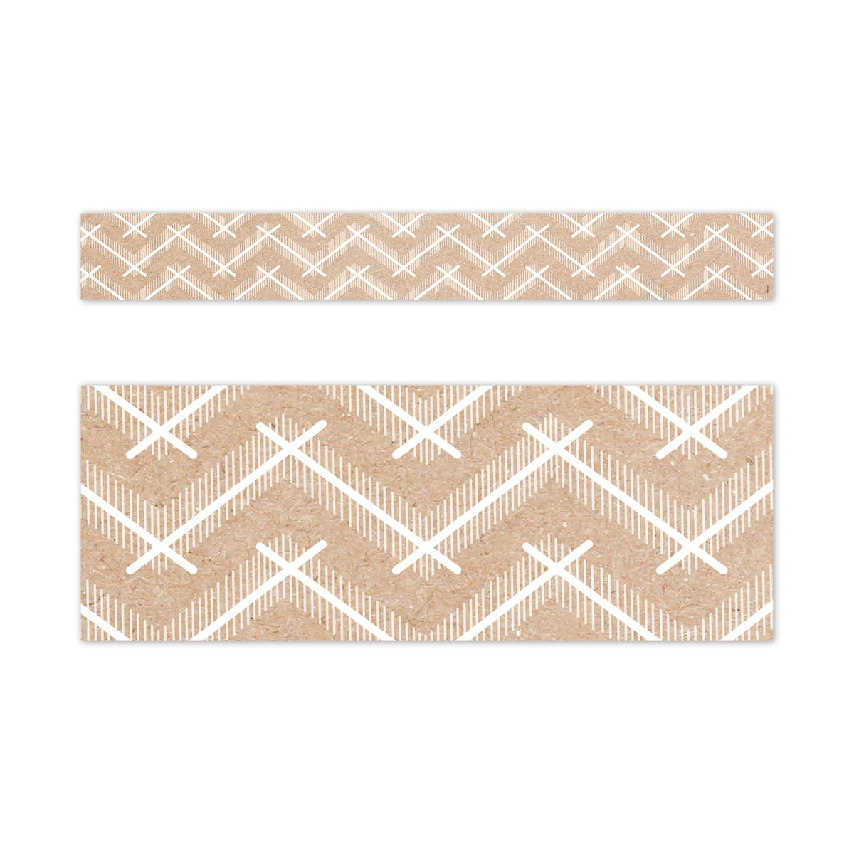 Add a creative touch to your bulletin board displays with the Kraft Chevron EZ Border, which features a white chevron pattern on a kraft-style background.