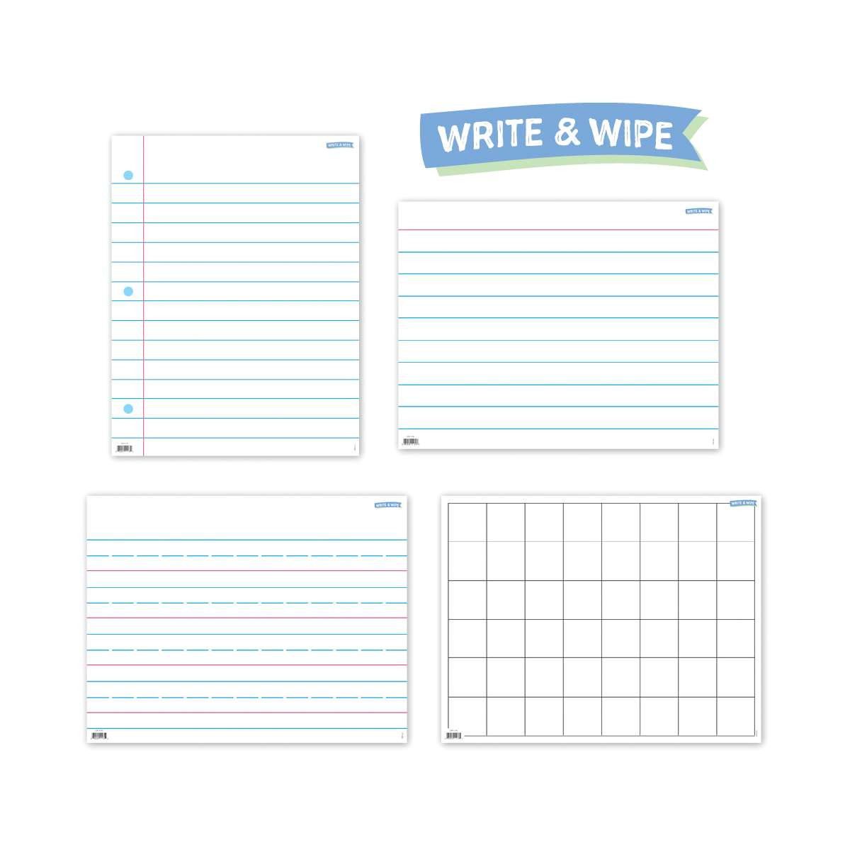 The big reusable classroom charts in this set provide writing templates in 4 familiar formats: a notebook page, index card, handwriting page, and graph and array. The write & wipe surface on these sturdy charts make them versatile teaching tools that you can use again and again. Great for whole-class instruction and interactive learning.