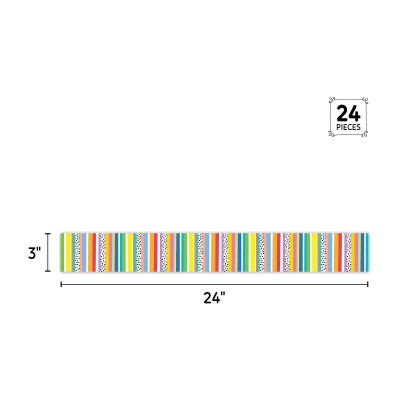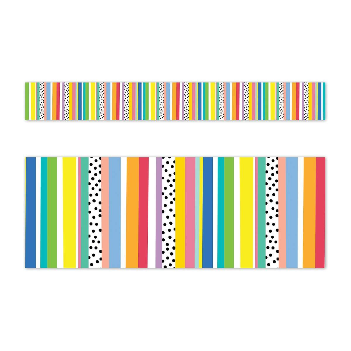 This Core Decor Stripes and Dots EZ Border features an array of colorful vertical stripes with a dash of black dots. This lively border will brighten any space. Perfect for use on bulletin boards in a wide variety of classroom, office, and school settings.