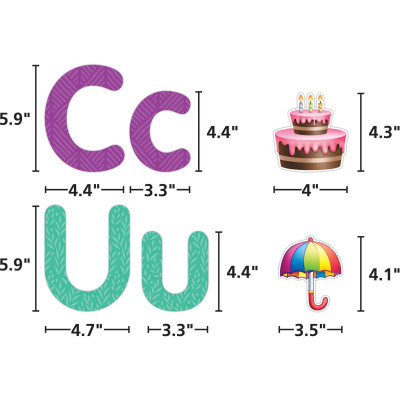 Brighten up your classroom with this vibrant alphabet bulletin board featuring bold, colorful letters paired with a coordinating illustration for each one! Each letter is brought to life with a playful image that helps reinforce letter recognition. Perfect for early learners, this engaging and educational set adds a fun touch to any classroom or learning space. Letters are 5¾" tall and the illustrations range from 3" to 6". 78 total pieces.