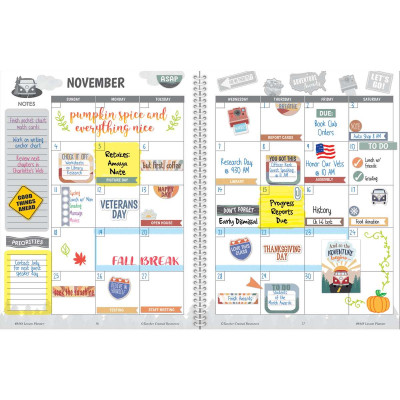 Keep up to 40 weeks of daily lesson plans in one convenient book. This book includes substitute teacher information, student roster sheets, and memorable quotations to use and discuss throughout the year. Twelve large monthly planning calendar spreads are also included for year-long lesson planning as well as for scheduling appointments, conferences, and events. The lesson planner also includes a variety of colorful stickers to use throughout the year. Whether you need to prioritize the day’s events, add weekly reminders, highlight something special, or simply provide a bit of inspiration, these cheerful stickers will keep your lessons beautifully organized.
