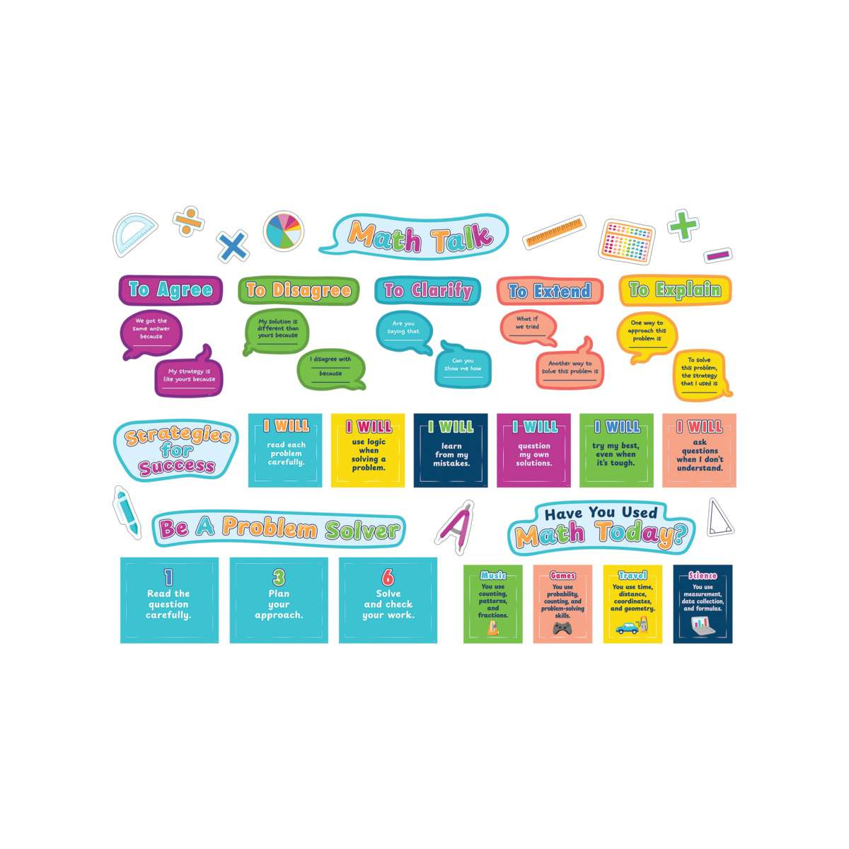 Transform your classroom into a hub of problem-solving and success with this engaging Math Talk Bulletin Board set! The vibrant visual references foster critical thinking, encourage perseverance, and help students apply math to real-life scenarios, while the skill and strategy cards support students in strengthening reasoning skills and evaluating mathematical processes. Largest piece measures about 20¾" x 3¼". 69 total pieces.