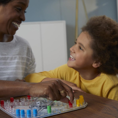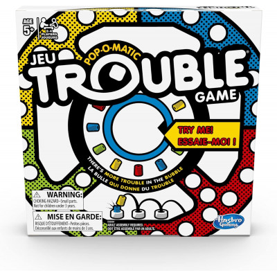 The Trouble game is peg-popping fun! The excitement begins as soon as a player presses the Pop-O-Matic bubble to roll the die. In the Trouble board game, kids race to get all their game pieces around the board; but be careful! A player could get bumped and sent back to the beginning. Kids can play the classic Trouble game or a more challenging version with Power Up spaces. Be the first player to get all 4 pegs into the Finish zone to win. The Trouble board game can be a fun activity for kids ages 5 and up -- 2, 3, or 4 players can play at a time. Hasbro Gaming and all related terms are trademarks of Hasbro. Includes gameboard, plastic game unit with Pop-O-Matic die roller, 16 pegs, and instructions.