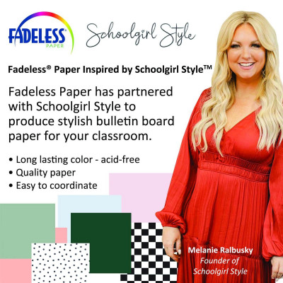 Fadeless Paper, the maker of quality fade-resistant bulletin board paper, and Schoolgirl Style, the popular classroom décor brand founded by Melanie Ralbusky, have partnered together to produce stylish bulletin board paper and bring these beautiful papers made in the USA to teachers looking to transform their classrooms! This premium, ultra fade-resistant paper is acid-free, making it ideal for long lasting displays. These new papers will coordinate beautifully with many popular themes and also with the Schoolgirl Style collections.