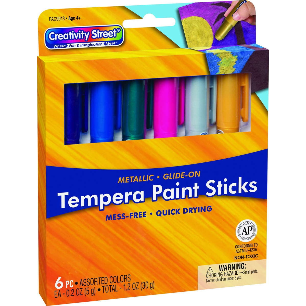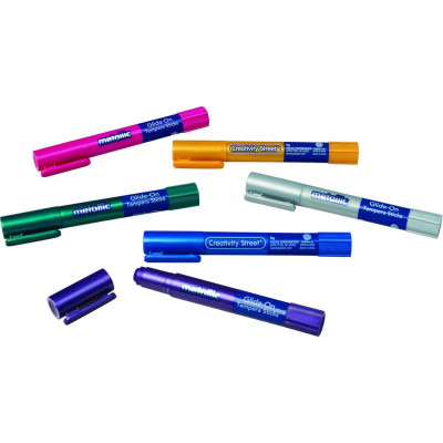 Our Creativity Street® Glide-On Tempera Paint Sticks are fun and easy to use to create beautiful works of art. They glide on surfaces such as paper, chipboard, plastic, and much more. These sticks do not bleed through, wrinkle or tear paper. The Metallic color assortment includes six colors: Metallic Pink, Metallic Green, Metallic Blue, Metallic Purple, Metallic Silver and Metallic Gold. Each stick is 5 grams. The wide barrels are easy for little hands to control. Twist the bottom of the barrel to push up more paint. Paint directly onto the art surface, or use with a paint brush by adding a little water in a paint pallet or tray.