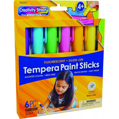 Our Creativity Street® Glide-On Tempera Paint Sticks are fun and easy to use to create beautiful works of art. They glide on surfaces such as paper, chipboard, plastic, and much more. These sticks do not bleed through, wrinkle or tear paper. The Fluorescent Color assortment includes six colors: Fluorescent Pink, Fluorescent Orange, Fluorescent Yellow, Fluorescent Green, Fluorescent Blue, Fluorescent Purple. Each stick is 5 grams. The wide barrels are easy for little hands to control. Twist the bottom of the barrel to push up more paint. Paint directly onto the art surface, or use with a paint brush by adding a little water in a paint pallet or tray.