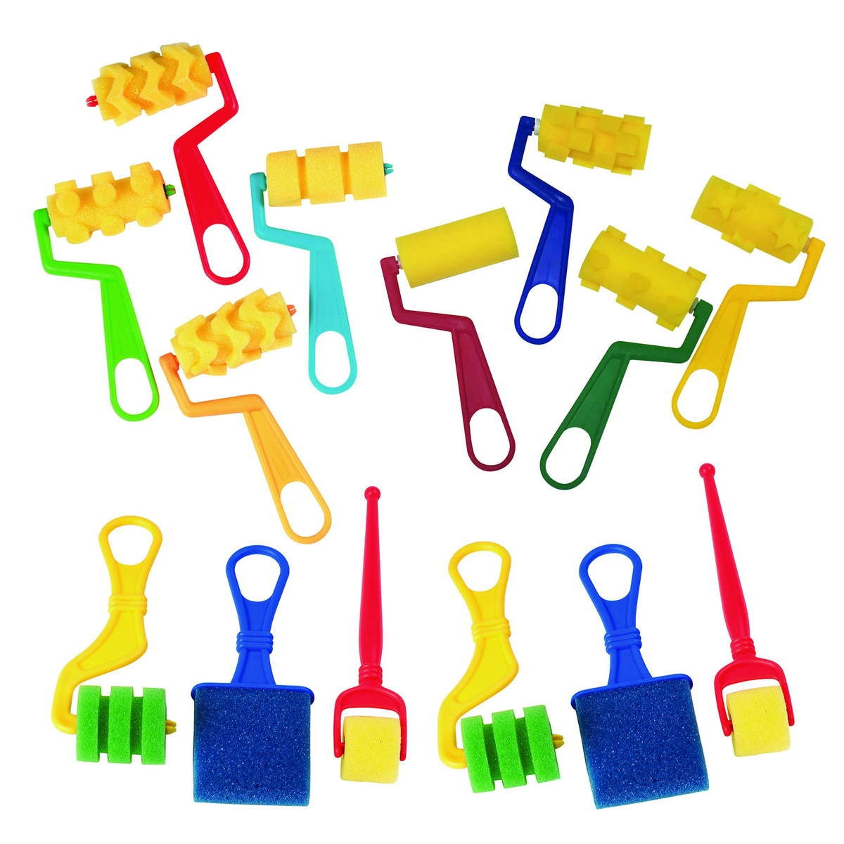 Durable foam brushes are fun to paint with and easy to clean! Item is a classroom pack containing eight foam rollers of zig-zags, dots, waves, stripes, wide stripe, checkerboard, hearts and stars, four smaller foam rollers, and two foam brushes. 14 pieces.