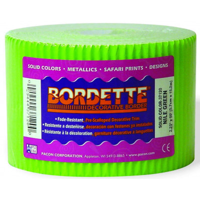 Bordette® is the original, pre-scalloped, fade-resistant decorative border. Use these sturdy corrugated borders to create unique 3-dimensional layered designs on any flat surface. Packaged in a perforated roll, Bordette® is easy to separate. One 50' roll of Bordette® will edge two 4' x 8' bulletin boards. Recyclable.