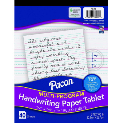 Our Pacon® Multi-Program Handwriting Papers offer rulings that conform to both the Zaner-Bloser™ and D'Nealian™ handwriting programs. Bright tablet paper ruled both sides with red baselines, blue dotted midlines and blue headlines. Ruling: 1/2" (short way) Dotted Midline: 1/4" Skip Space: 1/4"